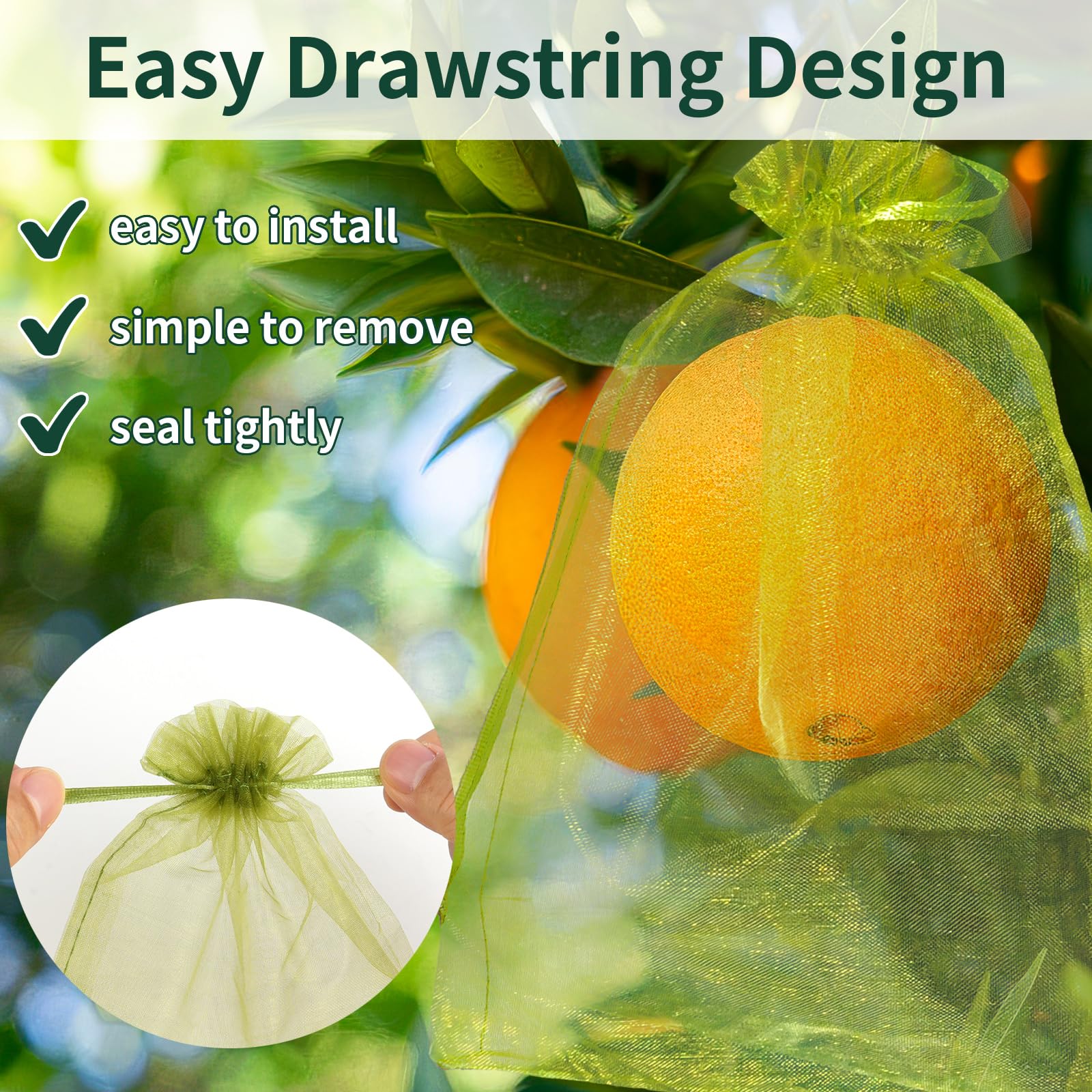 Easy Drawstring Design: Featuring a double drawstring closure, simple to install and remove, makes it easy to check ripeness; fits around fruits tightly and no gaps when tightened